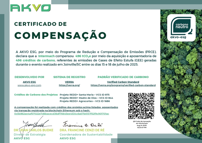 Com a certificação e o selo concedidos pela AKVO ESG, a Intermach se junta ao seleto grupo de eventos sustentáveis que assumem publicamente o compromisso com o combate às mudanças climáticas. O Selo Carbono Neutro conquistado em 2025 será referência para novas ações e poderá ser renovado na próxima edição do evento, mediante elaboração de novo inventário e implementação contínua de estratégias de redução e compensação.