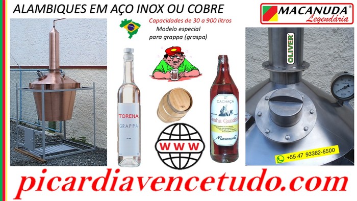 https://linktr.ee/torenamacanuda / www.macanudavencetudo.com / www.picardiavencetudo.com / [email protected] / WhatsApp 47 93382-6500 ...(destilador de cachaça, canha, aguardente) em aço inox, cobre ou misto aço inox e cobre. Capacidades de 30 a 900 litros. Aquecimento a lenha, a vapor ou a gás., Engarrafadoras, Tampadoras, Dornas, Tanques de armazenagem, Tampadoras de garrafas, Arrolhadoras, Completa linha de máquinas e equipamentos para derivados de cana-de-açúcar, produção de melado, açúcar mascavo e rapadura.